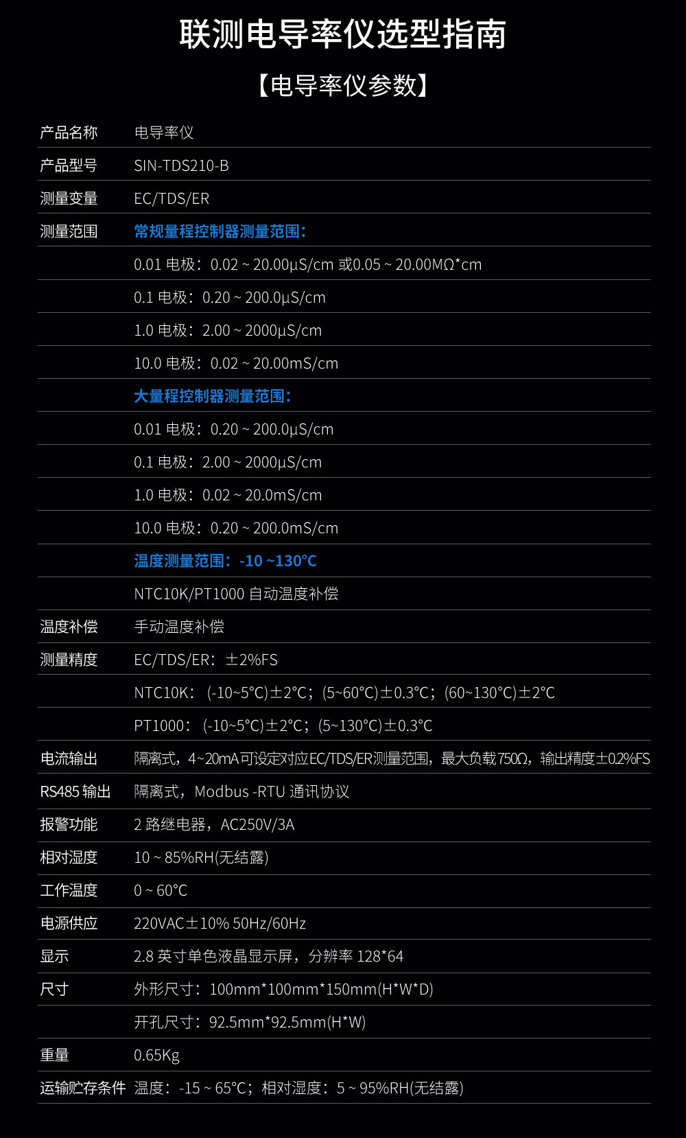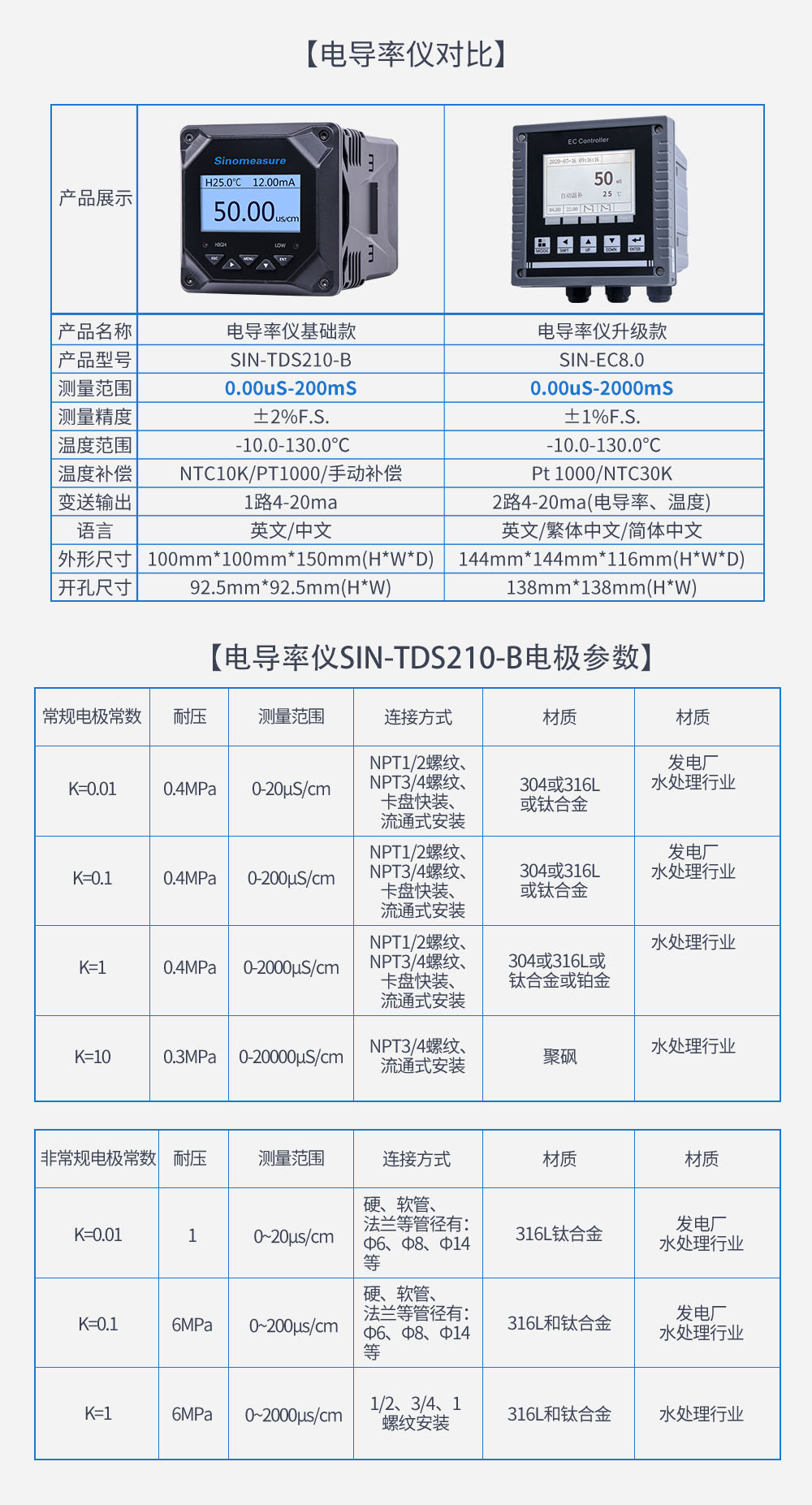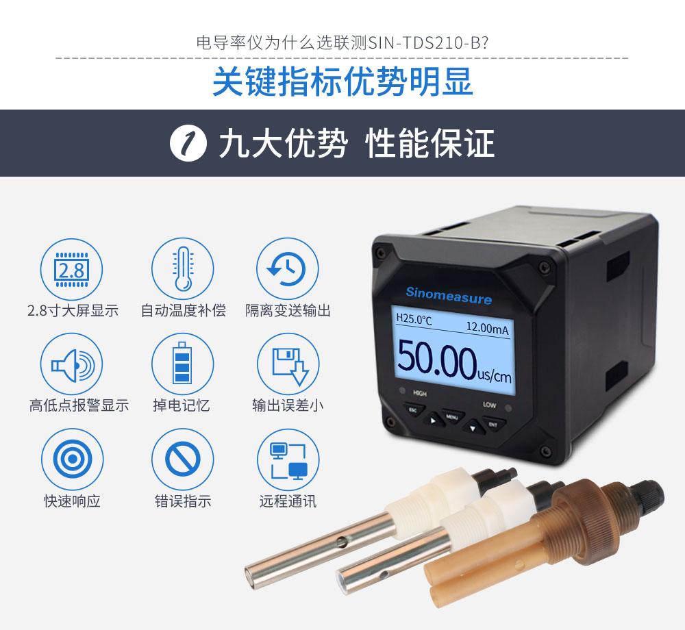 SIN-TDS210-B工業電導率儀表,廣泛應用于火電、化工化肥、冶金、環保、制藥、生 化、食品和自來水等行業。控制器主要對溶液中的電導率/總溶解固體/ 電阻率和溫度進行連續監測。