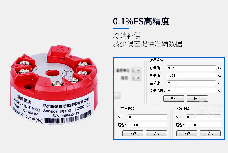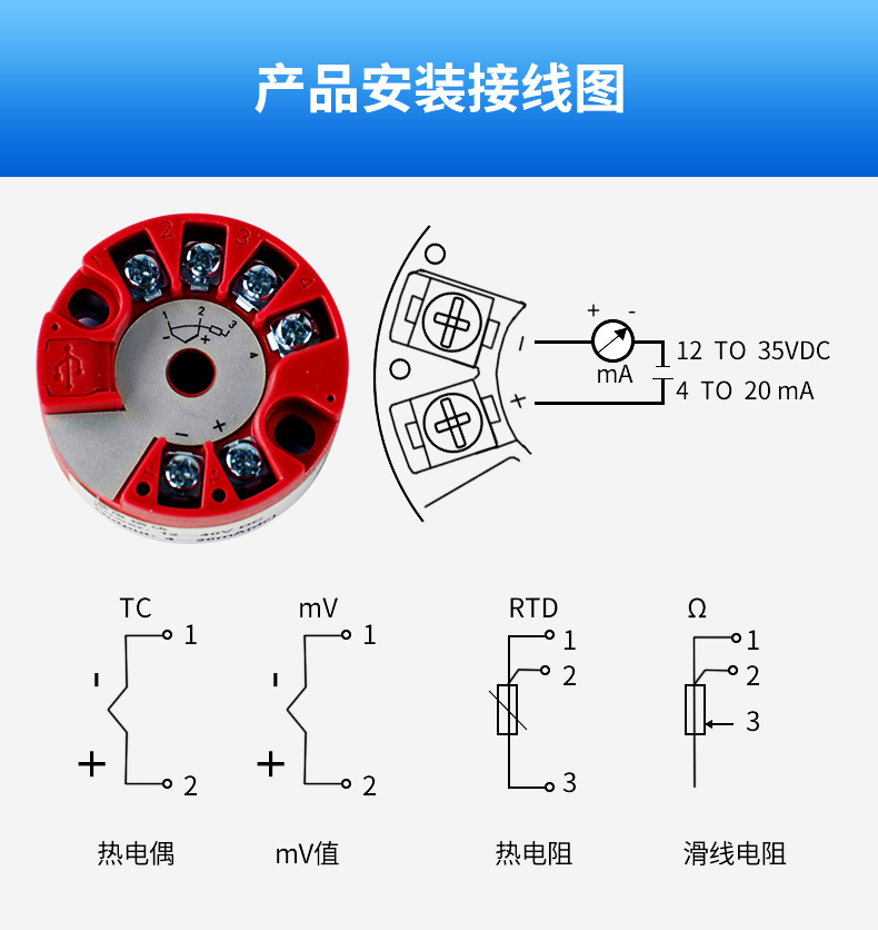 溫度變送器采用熱電偶、熱電阻作為測溫元件,從測溫元件輸出信號送到變送器模塊,經(jīng)過穩(wěn)壓濾波、運算放大、非線性校正、V/I轉(zhuǎn)換、恒流及反向保護等電路處理后,轉(zhuǎn)換成與溫度成線性關(guān)系的4~20mA電流信號0-5V/0-10V電壓信號,RS485數(shù)字信號輸出。