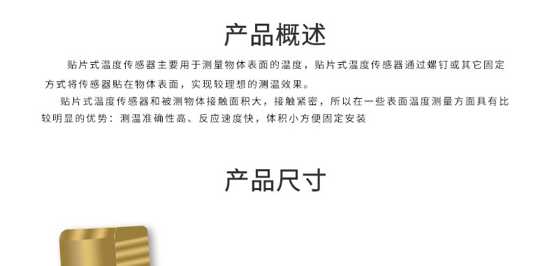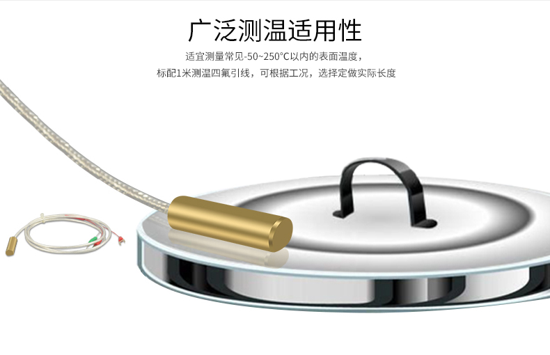 貼片式溫度傳感器主要用于測量物體表面的溫度,貼片式溫度傳感器通過螺釘或其它固定方式將傳感器貼在物體表面,實(shí)現(xiàn)較理想的測溫效果。