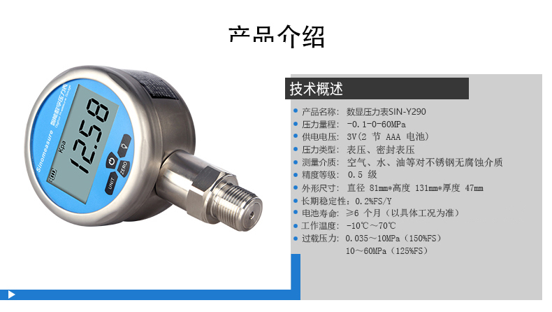 聯測數顯壓力表Y290,內置高精度壓力傳感器,能夠 準確的實時顯示壓力,并且具有精度高,長期穩定性好 的特點。