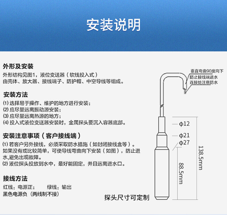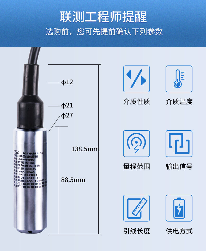 SIN-P260/P2600投入式液位變送器由高性能擴散硅壓阻式壓力傳感器作為測量元件,把與液位深度成正比的液體靜壓力準確測量出來