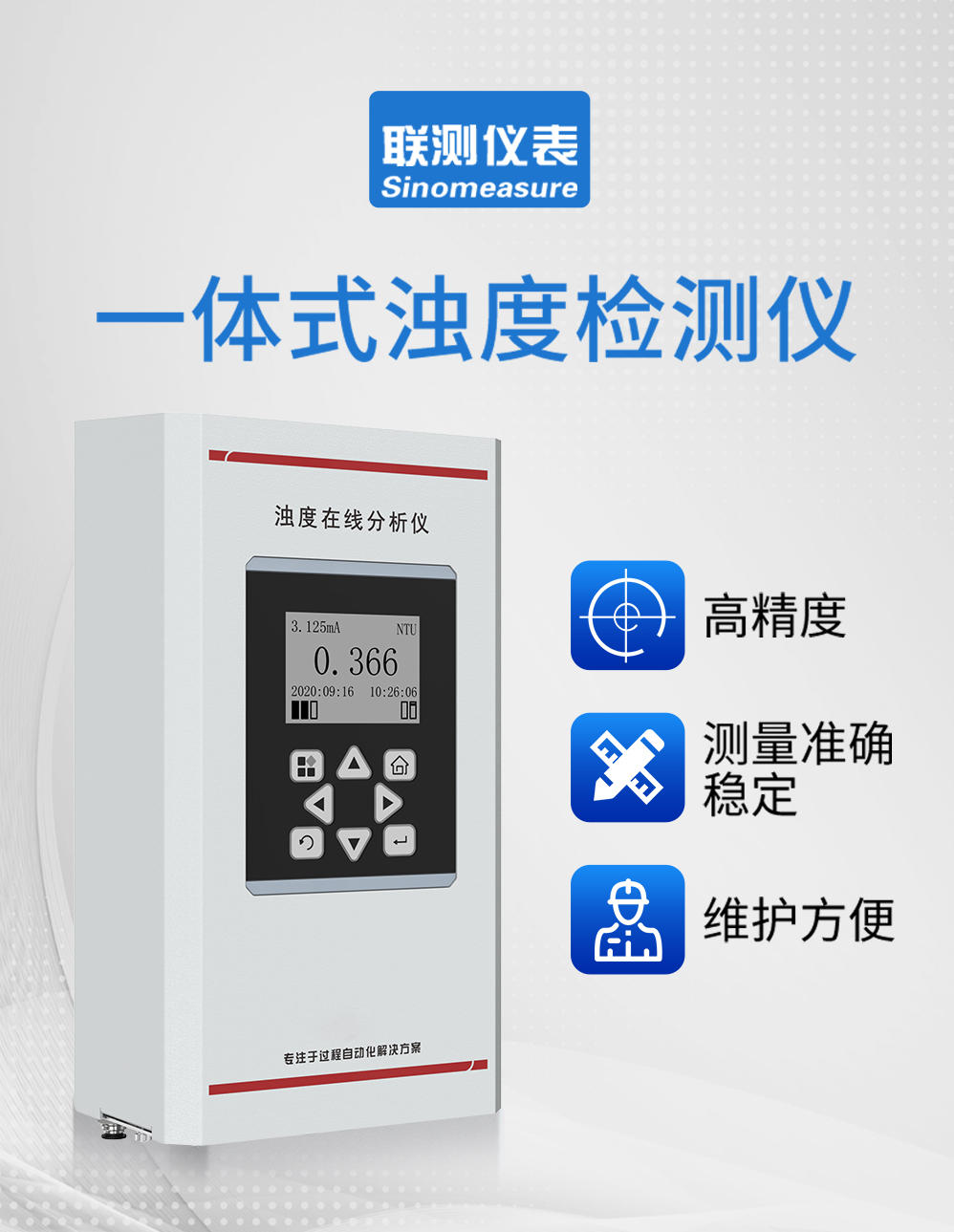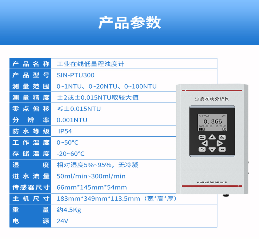 濁度在線分析儀將一束激光,從空氣中,按垂直于水面的方向,射 入水中。激光被水中的懸浮顆粒散射,水中的傳感器檢測出與入射光成 90 度方向的散射光強度,并根據校準表,將散射光強度換成成為濁度值
